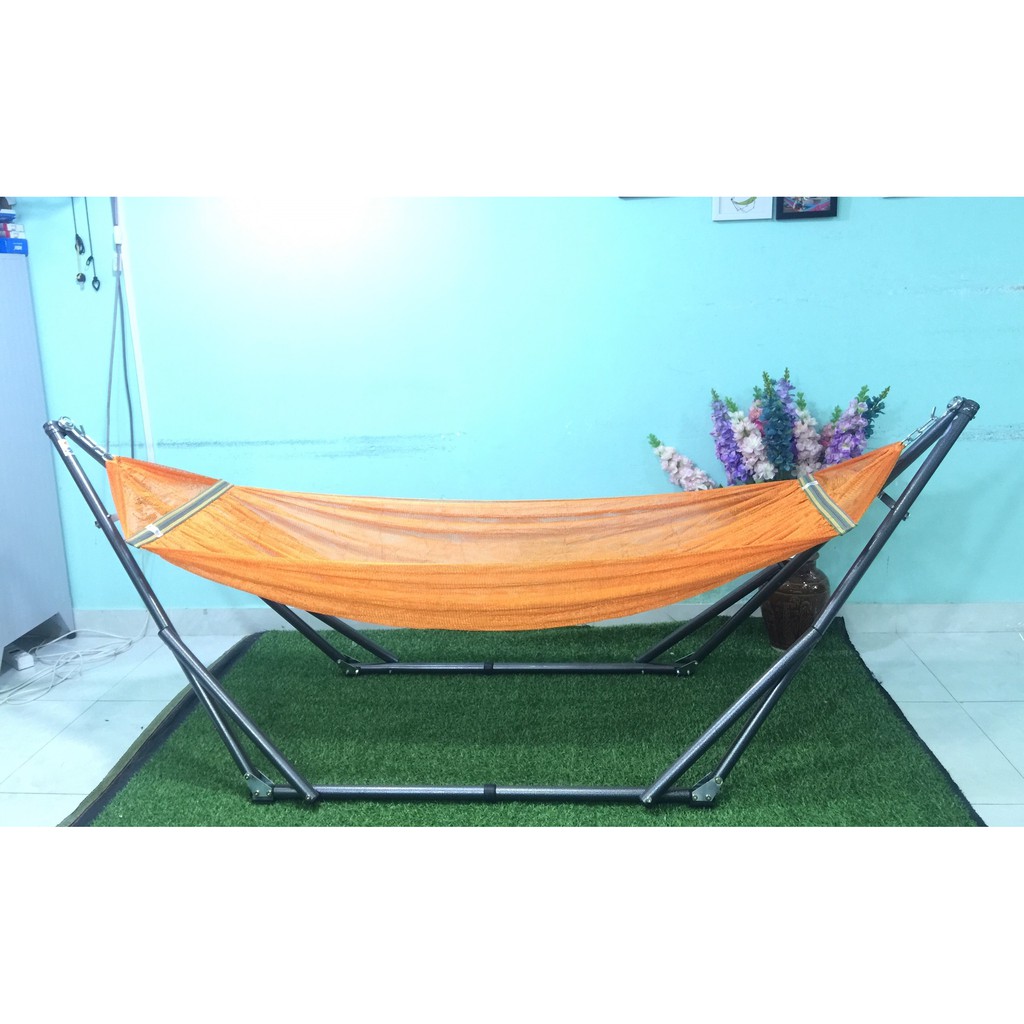 Khung võng xếp bằng ống thép: sơn tĩnh điện, đường kính 32.0mm, chiều dày 0.7mm (màu sần, bạc), 4 thanh chống cong:điều chỉnh độ dài & độ cao của khung võng.Kích thước sử dụng: trung bình 210 x 74 x 79 cm