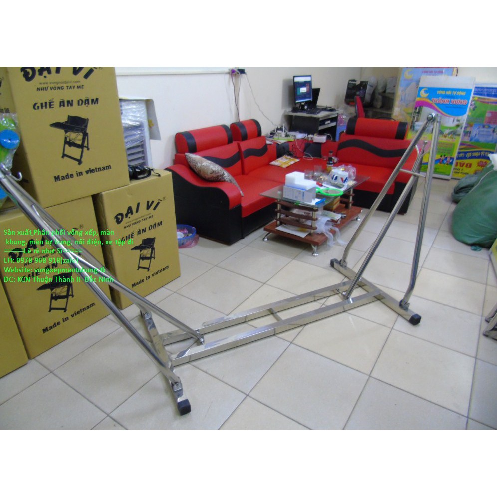 KHUNG VÕNG XẾP INOX THANG VUÔNG CAO CẤP PHI 40 CHƯA LƯỚIKhung võng xếp inox vuông là loại khung võng đế vuông phi 40 chất liệu inox 100%, sáng bóng không rỉ sét. Thiết kế đế vuông vững chắc không bị rung nảy khi đung đưa võng. Hàng chính hãng bảo hành 12 tháng.