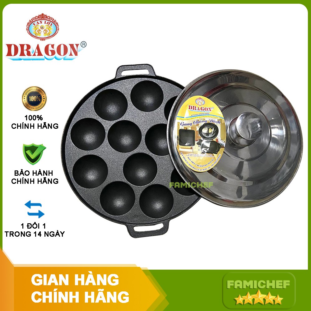 Thương Hiệu : Vạn Lợi Dragon - Khuôn gang dày dặn , nặng rất chắc chắn. Bề mặt phủ lớp chống dính xuất xứ từ Mỹ rất an toàn khi sử dụng. Nắp inox sáng bóng.- Kích thước : 31,5 x 27,5 x 3cm . Mỗi lỗ đường kính 6cm
