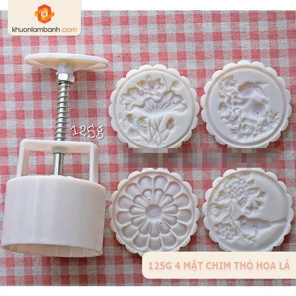 Khuôn bánh trung thu 125g 4 mặt chim thỏ hoa lá là mẫu khuôn trung thu lò xo mới, hoa văn nổi hiện đại. Khuôn được làm bằng nhựa ABS nguyên sinh, kiểu khuôn trung thu lò xo nhấn vô cùng tiện lợi khi làm bánh trung thu.- Khuôn bao gồm 1 dụng cụ nhấn và 4 mặt khuôn