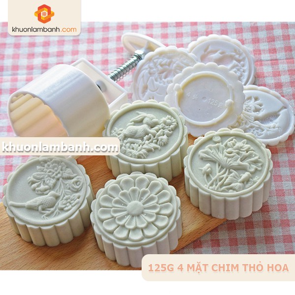 Khuôn bánh trung thu 125g 4 mặt tròn chim, thỏ, hoa lá