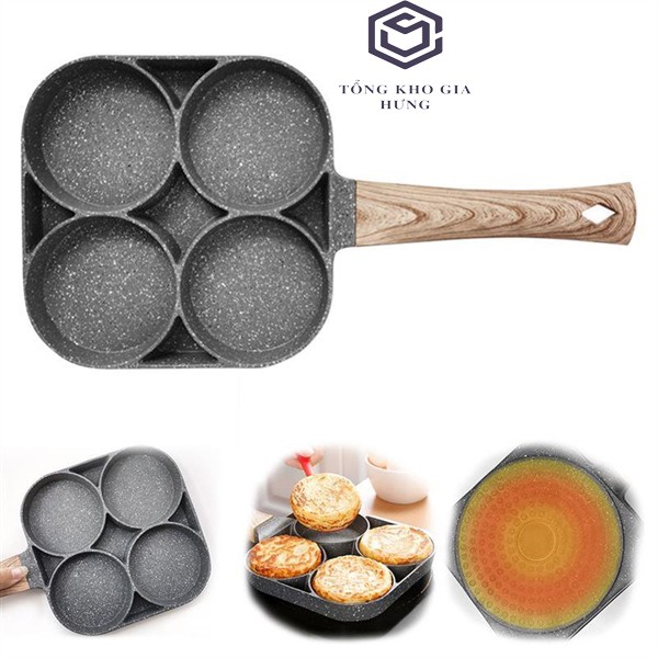 Khuôn Chảo Chiên Rán Trứng Làm Bánh 4 Ngăn 4 Lỗ Chống Dính- Chống Dính Tay Cầm Gỗ