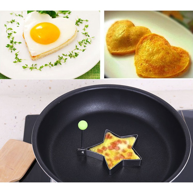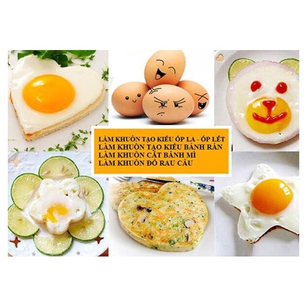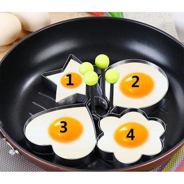 Khuôn chiên trứng tạo hình combo 4 chiếc mẫu khác nhauVới bộ 4 khuôn chiên trứng làm bánh tạo hình, món trứng ốp của bạn sẽ tuyệt đẹp. Có các hình trái tim, hình tròn, hình bông hoa, hình ngôi sao. Sử dụng rất đơn giản, bạn chỉ cần cho khuôn lên chảo, cho dầu vào, rồi đập trứng vô là xong. Cùng 1 chiếc chảo, bạn có thể ốp được 4 quả trứng cùng lúc. Thật tiện phải ko nào?!