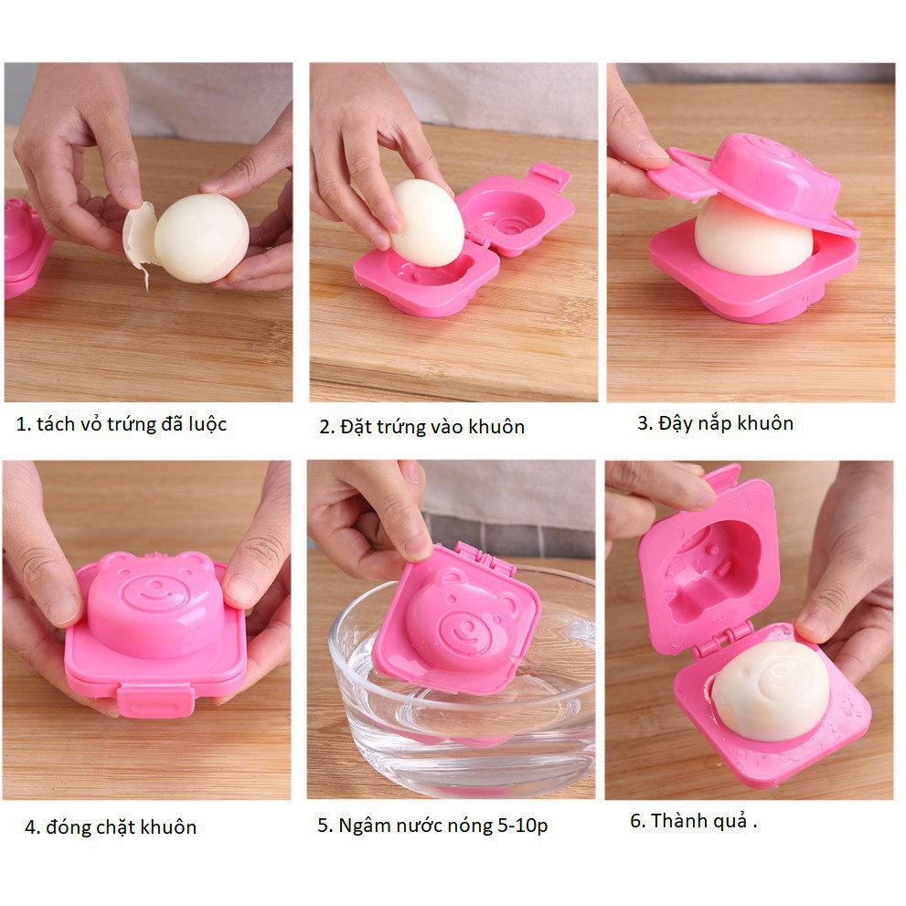 - Luộc trứng chín , sau đó bóc vỏ, cho quả trứng còn nóng vào khuôn.
