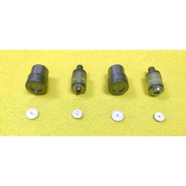 Đây là bộ khuôn dùng đóng nút bấm nhựa T5 (12mm), bộ khuôn gồm 4 cái, trên hình để 4 cái tương ứng với 4 thành của nút nhựa. Bộ khuôn sử dụng rất tiện lợi, ép nút nhanh và bền khi dùng để đóng nút áo mưa, áo em bé và đồ kiều các loại.Chú ý: Giá trên chỉ có bộ khuôn, muốn sử dụng thì phải mua thêm máy ép màu xanh và nút nhựa nhé