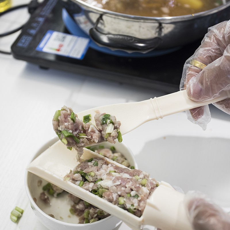 Dụng cụ được thiết kế gồm 1 đầu nhỏ, 1 đầu to và 1 thìa gạt giúp bạn tạo những viên thịt đều nhau mà không lo bẩn tay.- Chỉ cần cho giò sống, hoặc chả đã băm để vào đầu nhỏ hoặc đầu to (tùy bạn chọn) rồi dùng đũa gạt xuống là được.