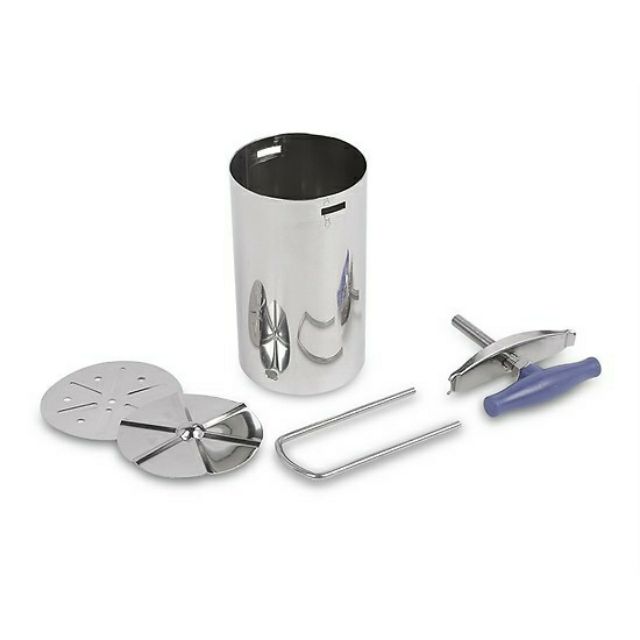 - Phần dưới của thành ống khuôn được đục 4 lỗ và có 2 cái que xiên bắt chéo để chèn chặt nắp đậy. Đáy khuôn là miếng inox có lỗ để cho mỡ chảy ra.