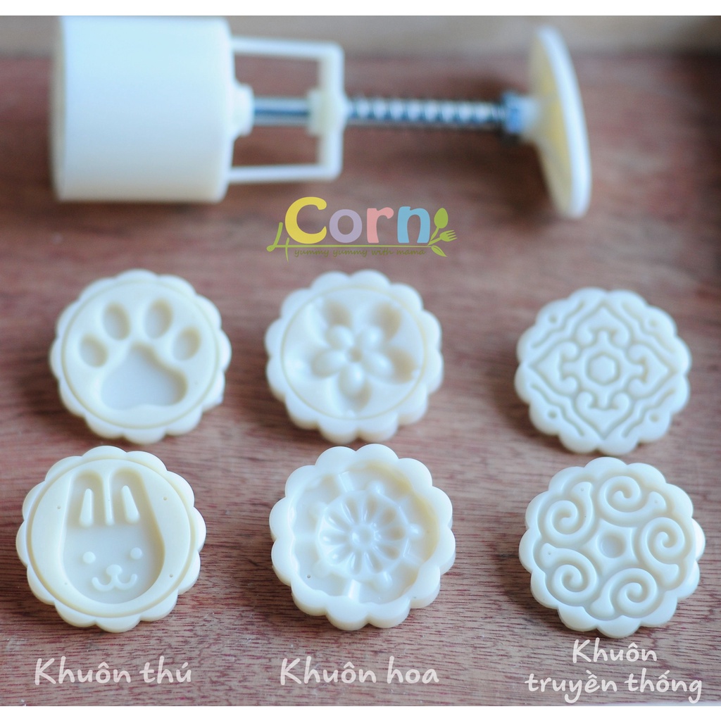 Bộ khuôn gồm 6 mặt: 2 hình hoa, 2 hình thú, 2 truyền thống. Tạo ra bánh 50gr phù hợp với em bé, dễ sử dụng, hình sắc nét.Liên hệ 4Corn để được tặng công thức làm bánh trung thu cho bé.