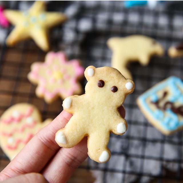 Dùng tạo hình làm bánh quy cho béKhuôn nhiều hình đa dạng: gấu, tim, sao, ngũ giác, viền hoa, ly rượu, ngôi nhà, người gừng, hoa 5 cánh, mèo,...