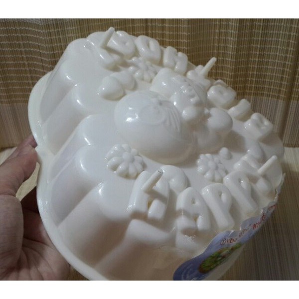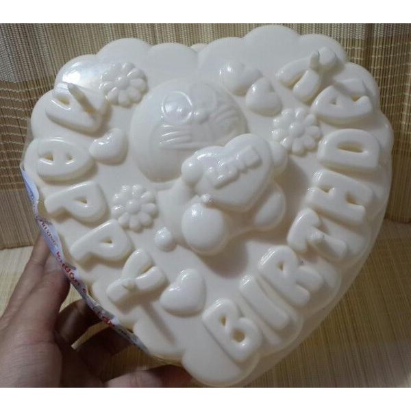 Khuôn rau câu happy birthday được thiết kế lạ mắt: khuôn bao ngoài hình trái tim gồm dòng chữ happy birth nỗi và hình chú mèo máy đô re mon ôm trái tim chữ Love rất dễ thương (như hình chụp), khuôn có 4 chân đế bằng nhựa giúp khuôn đứng vững trong quá trình sử dụng