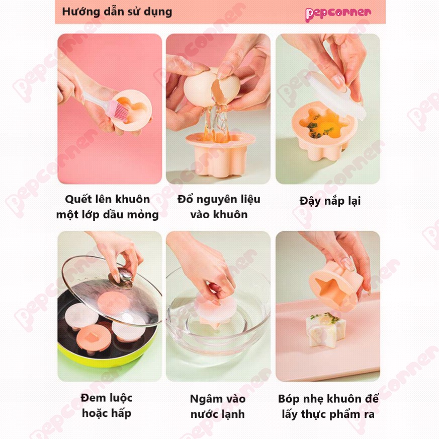 - HDSD: 1. Quết một lớp dầu mỏng lên khuôn 2.Đổ nguyên liệu vào 3.Nướng, luộc, hấp tùy ý 4.Ngâm vào nước lạnh 5.Bóp nhẹ khuôn để lấy thực phẩm ra.