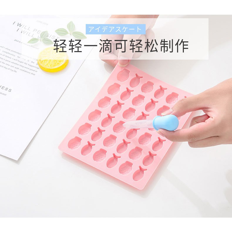 Khuôn không kèm ống nhỏ giọt mà bán rời để tiết kiệm chi phí vì khách có thể mua nhiều khuôn nhưng ống bóp thì có thể dùng 1 cái. Do nhà cung cấp không bán ống bóp chọn màu mà giao ngẫu nhiên nên shop mình cũng giao màu ngẫu nhiên tùy lô nhận được.