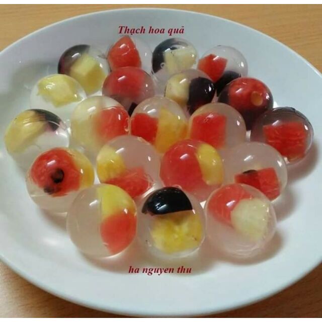 🔵Cách làm thạch trái cây viên bi tròn : Đặt trái cây đã được chuẩn bị vào đế 1/2 hình tròn , từ từ đổ nước thạch vào lấp đầy khuôn, sau đó lấy nắp 1/2 hình tròn còn lại đậy lên, lưu ý làm nhẹ nhàng để nước thạch trào ra ngoài càng ít càng tốt. Sau đó bạn đặt vật nặng lên trên mặt khuôn để cố định khuôn thạch.