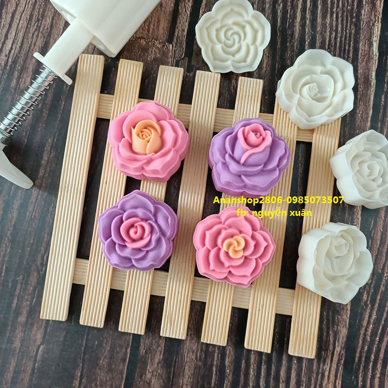 1. Khuôn trung thu lò xo 50gr 4 mặt hoa hồng 3D 2021Bộ gồm: 1 nhấn lò xo + 4 mặt y hình
