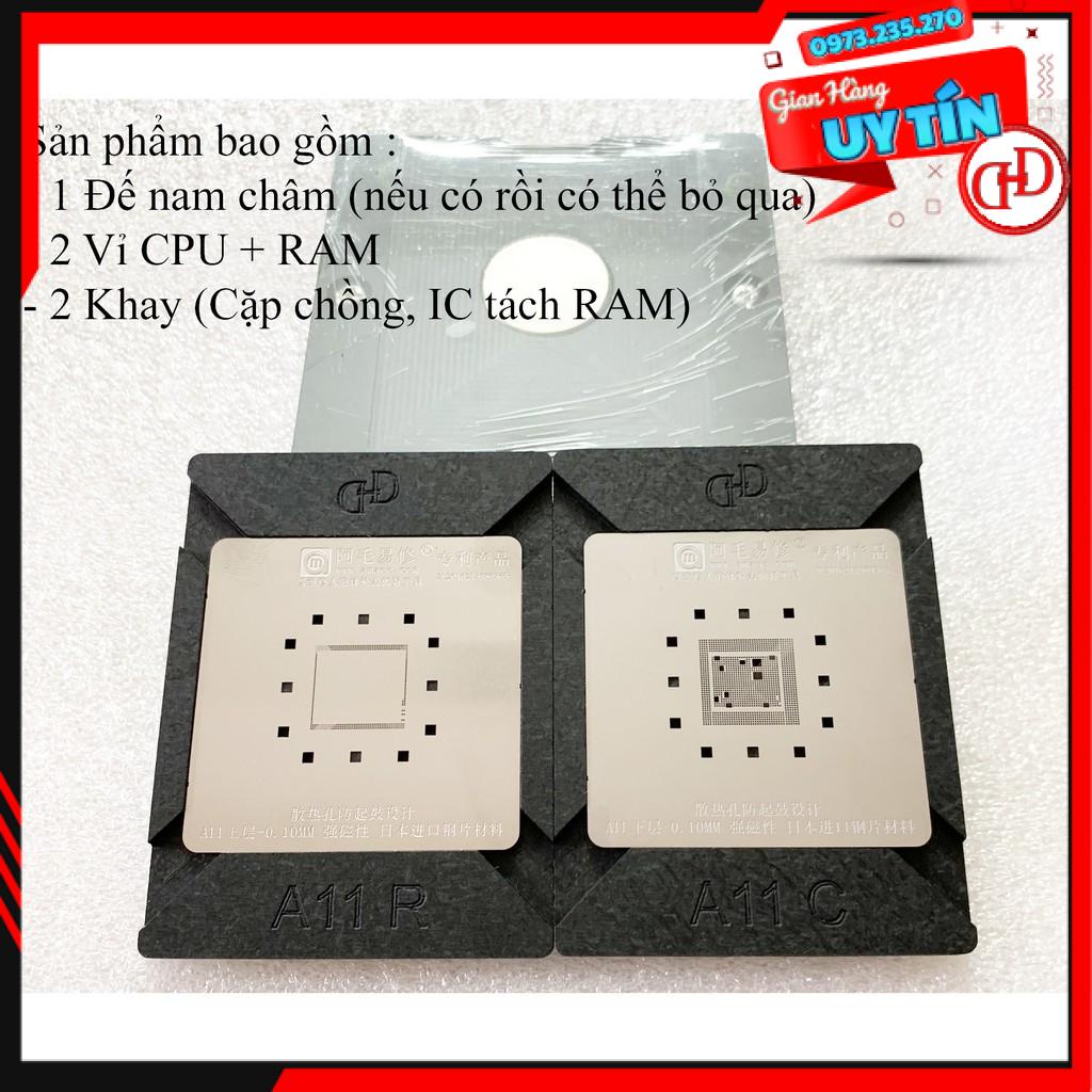 Khuôn vỉ đổ chân CPU + RAM A11 (cặp chồng và RAM tách) là bộ đế đổ chân cho ic A11 vẫn giữ nguyên cặp chưa tách rời U và RAM đã tách rồiLƯU Ý: Sản phẩm chưa bao gồm đế hút nam châm