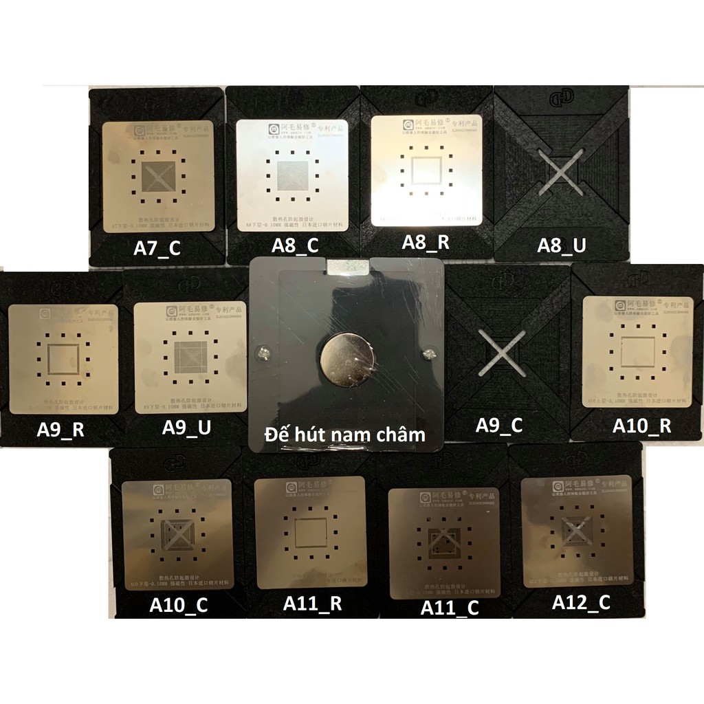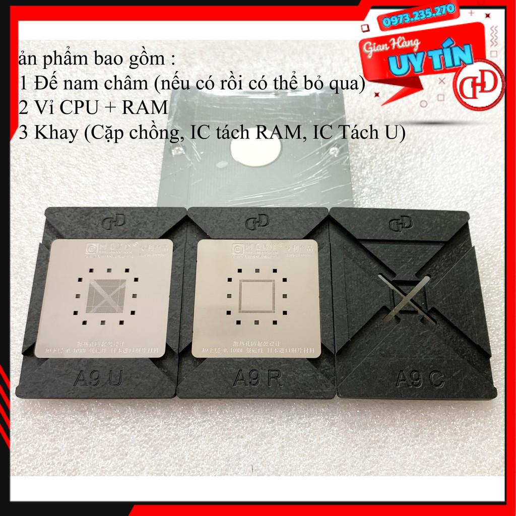 Khuôn vỉ đổ chân CPU + RAM A9 (cặp chồng,U tách và RAM tách) là bộ đế đổ chân cho ic A9 vẫn giữ nguyên cặp chưa tách rời U và RAM đã tách rồiLƯU Ý: Sản phẩm chưa bao gồm đế hút nam châm