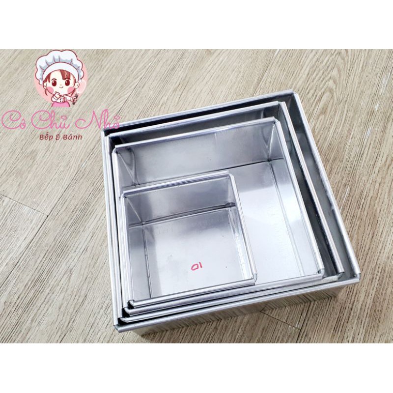 Khuôn nhôm vuông gia công đế rời hàng đăt chuẩn 10 - 16 - 18 -20 - 22 cm, chiều cao 8cm- Dùng để nướng bánh bông lan bơ, bánh gateu sinh nhật, cưới hỏi bánh mousse, bánh cheese cake...