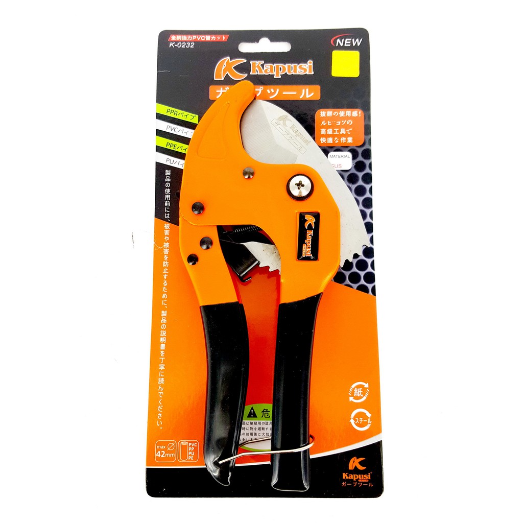 Việc cắt ống nhựa PVC là công việc thường xuyên của những người thợ nước. Chiếc kéo cắt ống nhựa PVC KAPUSI là một dụng cụ cắt ống rất sắc bén và chỉ cần một tay là thao tác được.Lưỡi kéo được sản xuất từ thép hợp kim nhôm cao cấp tạo sự cứng rắn đến độ cứng 61, chống cong vênh và gỉ sét; đồng thời thép hợp kim nhôm với khả năng mài mỏng đến 0.01mm sẽ tăng độ sắc bén để cắt các loại ống nhựa.