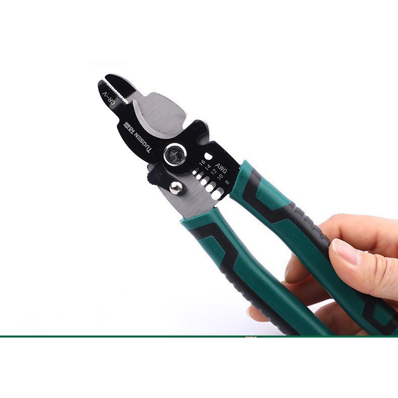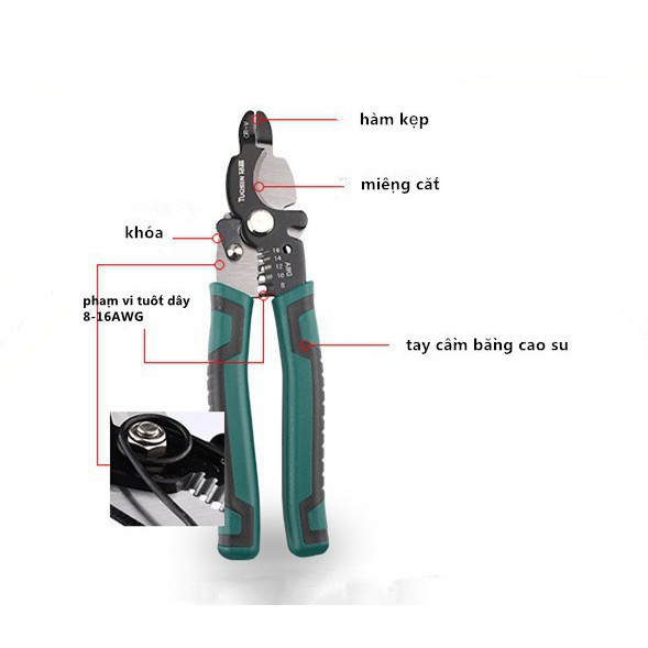 Kìm tuốt dây điện mỏ nhọnSản phẩm tích hợp 3 chức năng: kẹp dây, tuốt dây và cắt dây.
