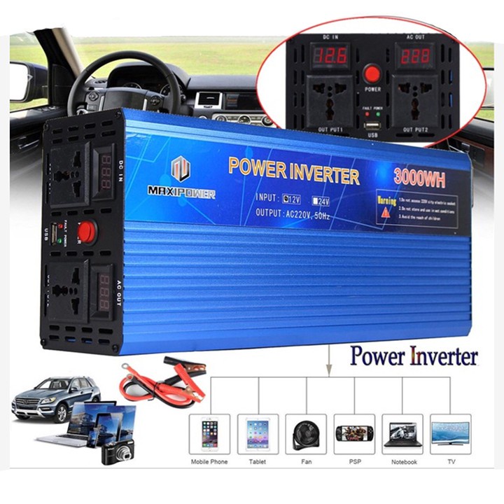 - Máy Thực Phẩm xin giới thiệu sản phẩm Bộ kích điện 24V - 220V - 3000W MAXIPOWER chức năng dùng đổi nguồn từ bình ắc quy 24V sang 220V sử dụng cho các thiết bị điện trong gia đình.