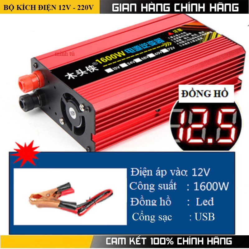 Bộ kich điện 1600w SÓNG SIN chuyển đổi điện áp từ 12V lên 220V mẫu mớiThông số kỹ Thuật Bộ kich điện 1600w: