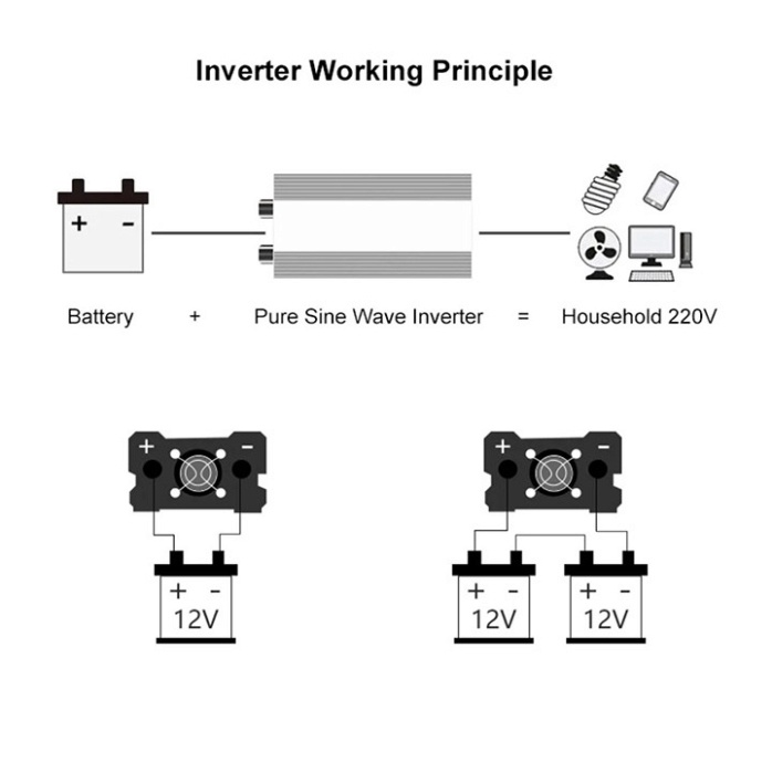 - Lưu ý: Thời gian sử dụng điện 220W phụ thuộc vào nguồn điện 24V & công suất tải, thường thì sử dụng bình acquy 24v có dung lượng cao sẽ đảm bảo thời gian sử dụng.