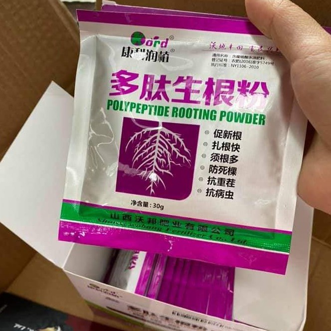Thuốc kích rễ Polypeptide Rooting Powder là chất điều hoà sinh trưởng thực vật có tác dụng tăng cường và điều chỉnh hàm lượng hormone nội sinh thực vật và hoạt động của enzyme, thúc đẩy quá trình tổng hợp các đại phân tử phân mô tế bào mới, hình thành rễ cực nhanh và tăng tỷ lệ sống của cây, kể cả các loại cây khó ra rễ nhất.Giải quyết các vấn đề về sinh trưởng từ bộ rễ và thúc đẩy ra rễ mới. Ra rễ nhanh. Rễ xơ nhiều, ngăn ngừa cây chết, chống úng gốc.