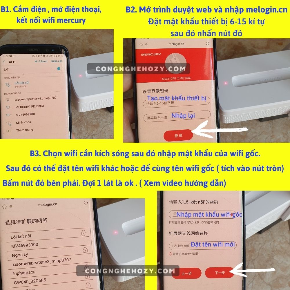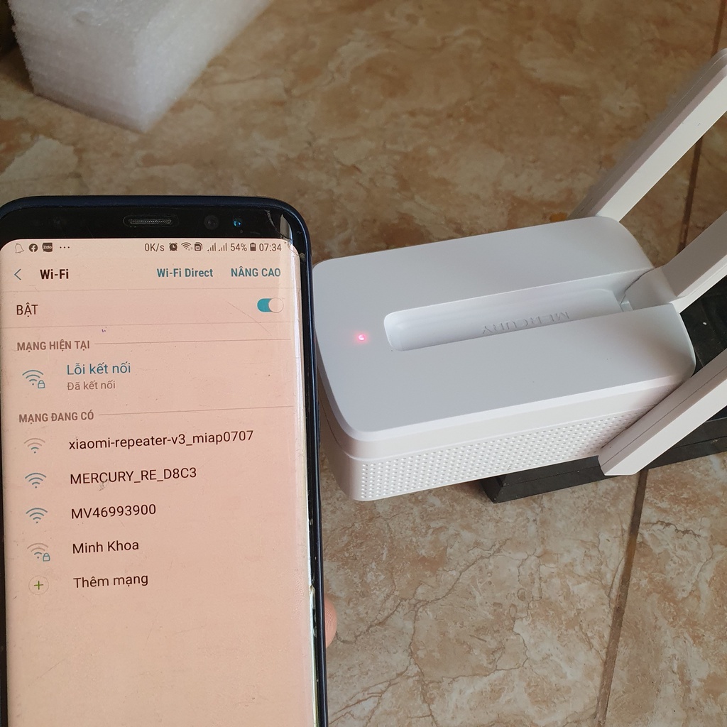Bước 1: Cắm bộ mở rộng sóng WiFi Mercury vào nguồn điện. Dùng điện thoại để kết nối với sóng WiFi của Repeater Mercury. tắt mạng di động