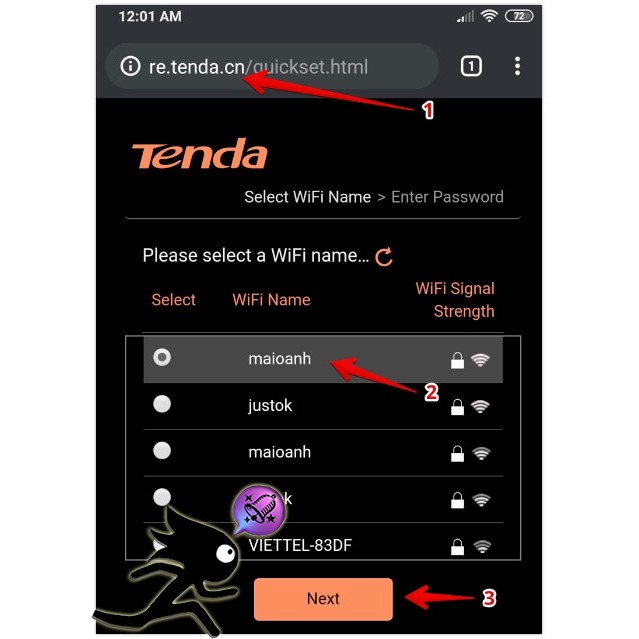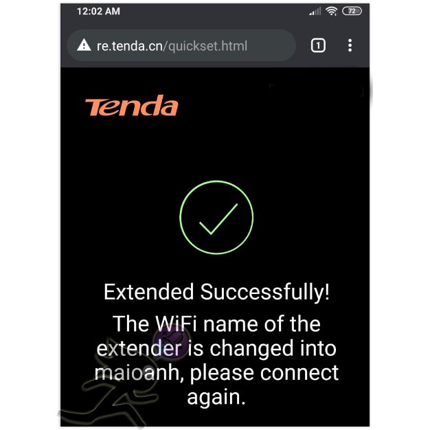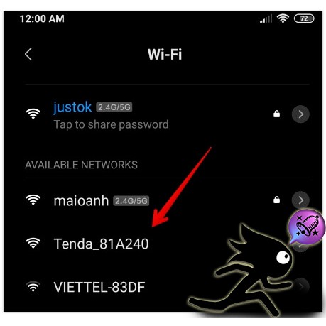 Dòng bên dưới: re.tenda.cn là địa chỉ internet chúng ta sẽ truy cập vào để cài đặt cục kích sóng A12 sau khi chúng ta kết nối wifi vào wifi phía trên.