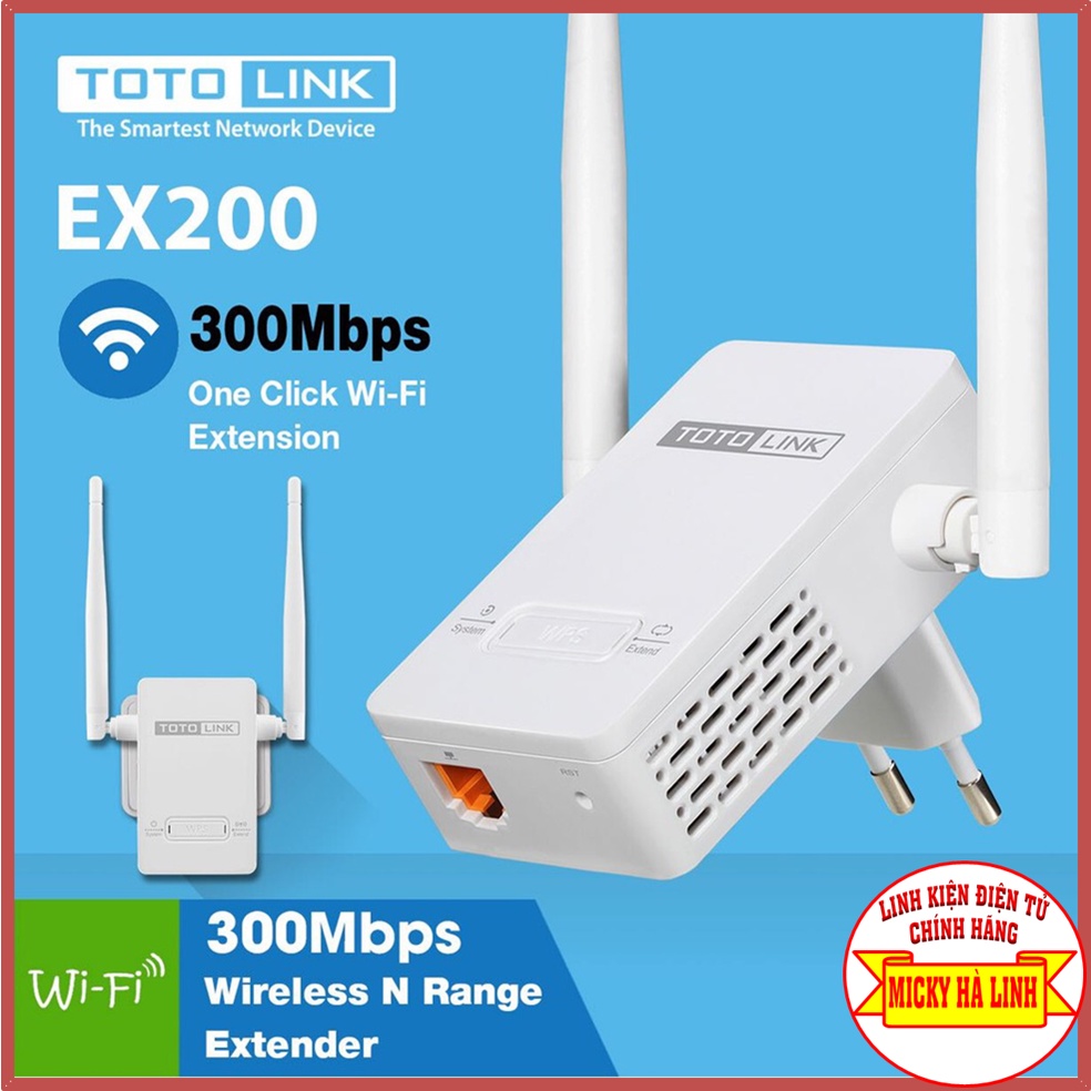 Bộ Kích Sóng Wifi Totolink EX200 2 Anten, Có Repeater Chính HãngWifi repeater chuyên dụng TOTOLINK EX200 có kích thước rất nhỏ gọn nhưng khả năng thu và phát sóng cực kỳ mạnh mẽ với công nghệ chuẩn wireless N tốc độ lên đến 300 mbps.