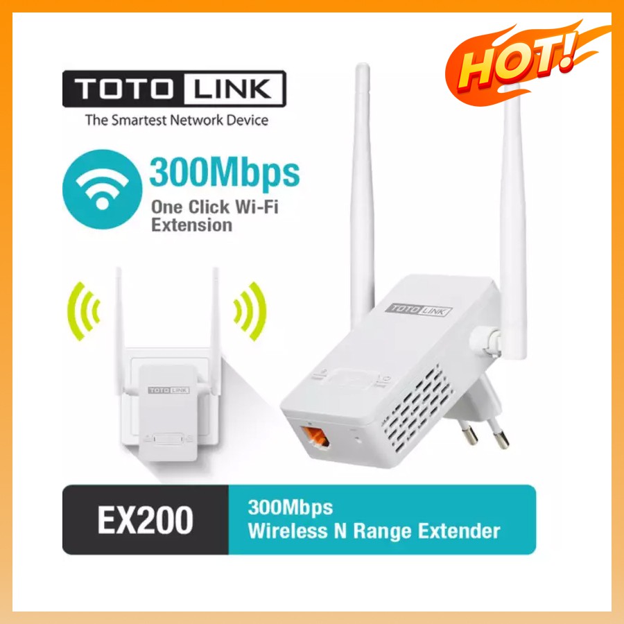 - Wifi repeater chuyên dụng TOTOLINK EX200 có kích thước rất nhỏ gọn nhưng khả năng thu và phát sóng cực kỳ mạnh mẽ với công nghệ chuẩn wireless N tốc độ lên đến 300 mbps.