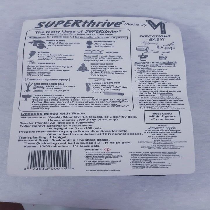 Pha loãng dung dịch trong nước ấm, bằng cách lấy 1 bình xịt chuyên chỉ để phun SUPERthrive, đổ nước ấm vào sau đó cho SUPERthrive vào. Một tỷ lệ tốt là hai giọt chất lỏng cho mỗi 8 ounces nước ( khoảng hơn 200ml nước- tức là 1 giọt cho 100ml là tốt nhất). Vặn chặt nắp đậy. Lắc mạnh bình cho hoà tan hoàn toàn dung dịch. Rửa sạch tay sau khi chuẩn bị dung dịch hoặc nên rửa sạch tay nếu bị tiếp xúc với da tay.*** Không sử dụng SUPERthrive trong khi hoa nở. Tuy vậy, có thể bổ sung dinh dưỡng qua gốc cho cây, vì khi nở hoa cây mất nhiều năng lượng. Có thể phun trong mùa đông cho cây nếu thấy cần thiết hoặc khi giá thể đã phân huỷ. Luôn rửa tay sạch sau khi sử dụng.