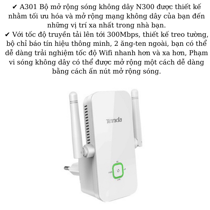 Máy tính & Laptop > Thiết Bị Mạng > Bộ Kích Wifi || Kích wifi Tenda A301 , tốc độ 300Mbps , tích hợp 2 anten mạnh mẽ , bắt sóng siêu xa , có cổng Lan , bảo hành chính hãngCòn hàng