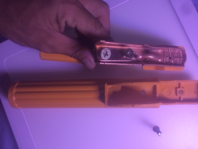 Thía 2 ốc ớt ngoài thân kiêm rồi rút ống mủ chịu nhiệt ra sẽ thấy thân bằng đồng ..mở 2 ốc ở sau đuôi.. cho ống cách nhiệt kiềm Hàn vào dây Hàn .tách dây Hàn khỏi vỏ khoảng 4 phân se chặt dây đồng trước bỏ vào kẹp Hàn..so đó siết ốc cho chặt vào là xong 1 cây kiềm Hàn