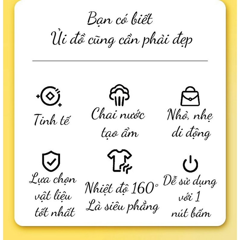 -Bàn là/ủi cầm tay mini: Dễ dàng ủi bay mọi vết nhăn, nhiệt độ 160° giúp việc là ủi thẳng các vết nhăn trên quần áo một cách dễ dàng.