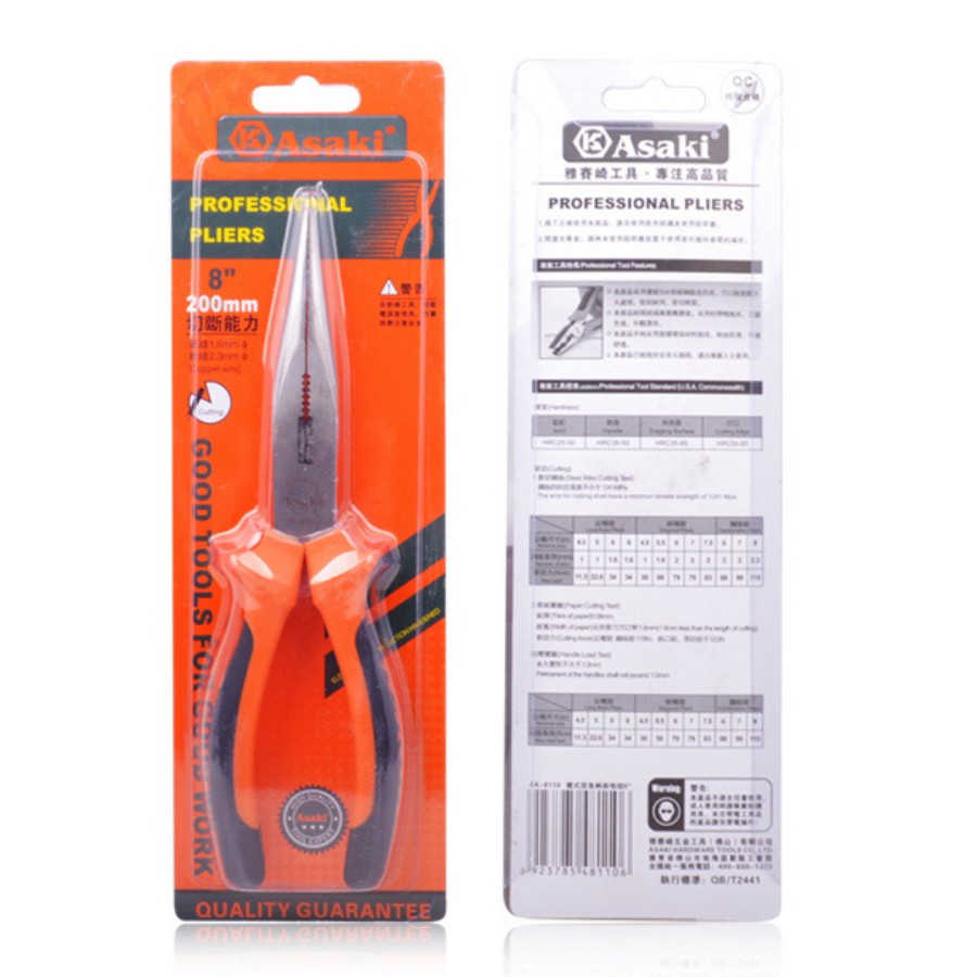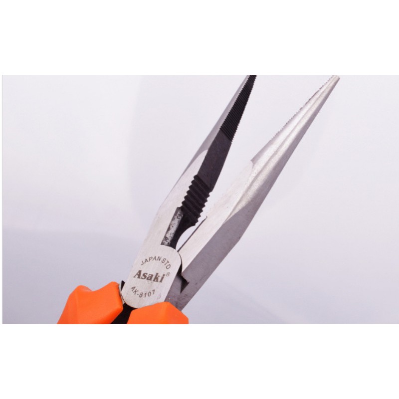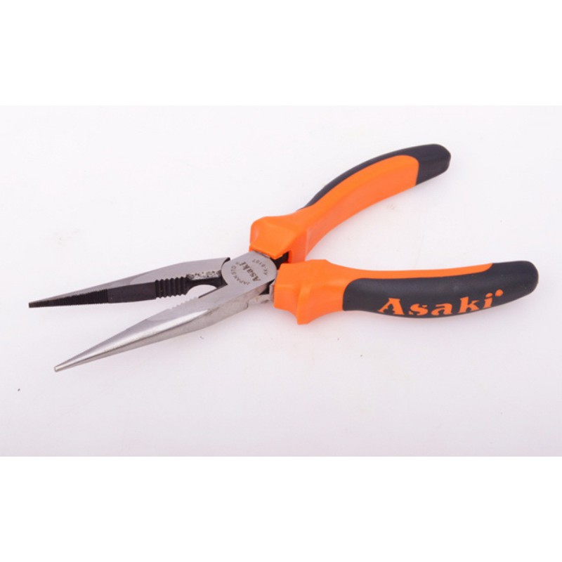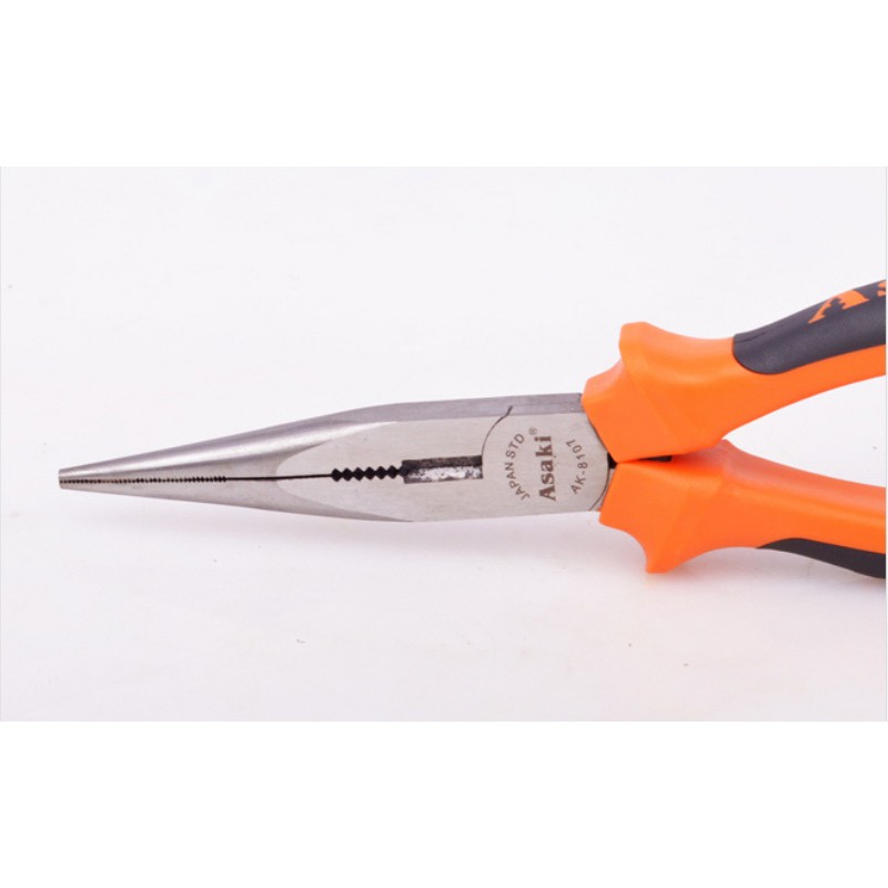 Kìm nhọn asaki 6' 8'+ được làm từ chất liệu thép siêu cứng không bị han rỉ, tay cẩm bọc nhựa êm ái không đau tay khi sử dụng