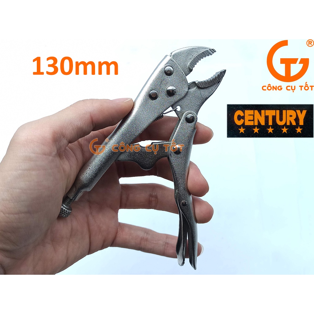 Kìm chết có rất nhiều kiểu ngàm khác nhau như loại 1 ngàm cong-1 ngàm thẳng, ngàm có 2 điểm cong, ngàm nhọn,….Kìm chết Century có ngàm cong vát hình tam giác, người thợ có thể dễ dàng điều chỉnh độ mở ngàm rồi khóa lại nhờ vít điều chỉnh bên dưới cán kìm. Xoay vít điều chỉnh theo chiều kim đồng hồ để siết ngàm ôm chặt lấy những vật nhỏ và mỏng. Ngược lại, khi muốn kẹp giữ những chi tiết có kích cỡ lớn và dày thì người dùng cần vặn vít ngược chiều kim đồng hồ.