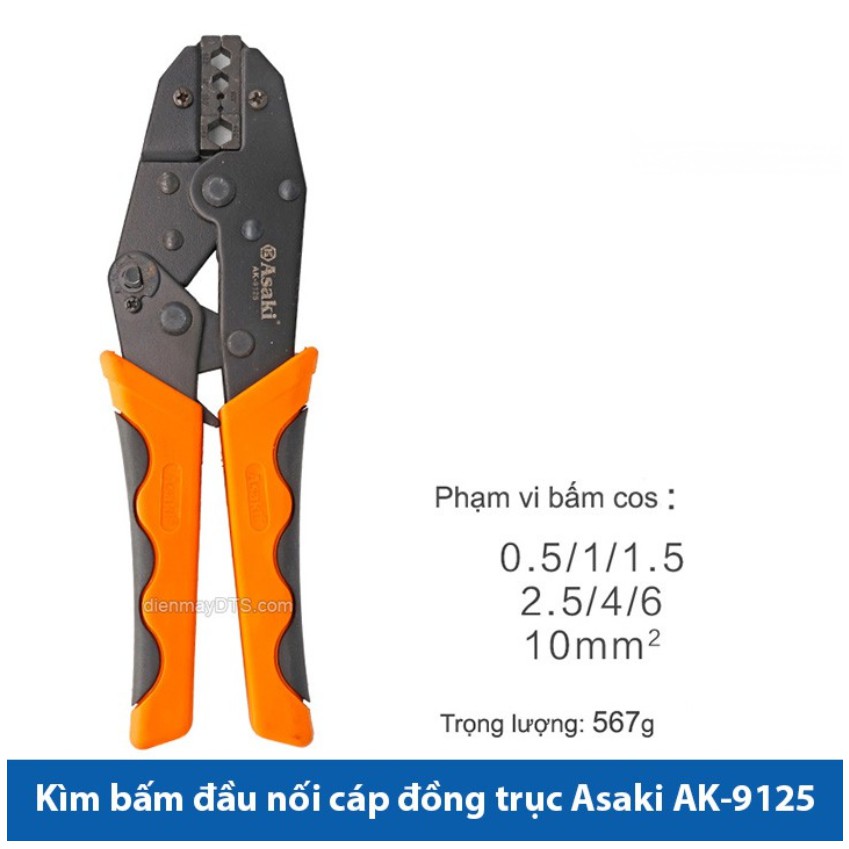 - Kìm bấm cos nối cáp đồng trục 0.5 ~ 10mm2 Asaki AK-9125