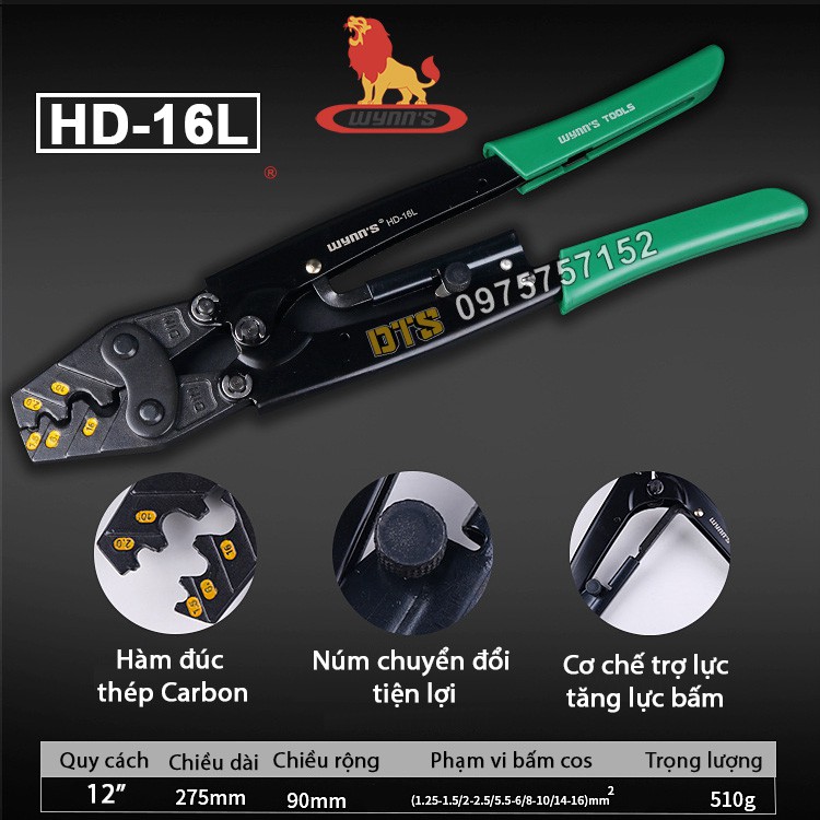 Giới thiệu Kìm bấm cos cộng lực 16L 1.25 – 16mm2 WYNN'S HD-16L, hàm đúc thép Carbon, tiết kiệm lực, kìm bấm cos 16, kềm bấm cốt 16L