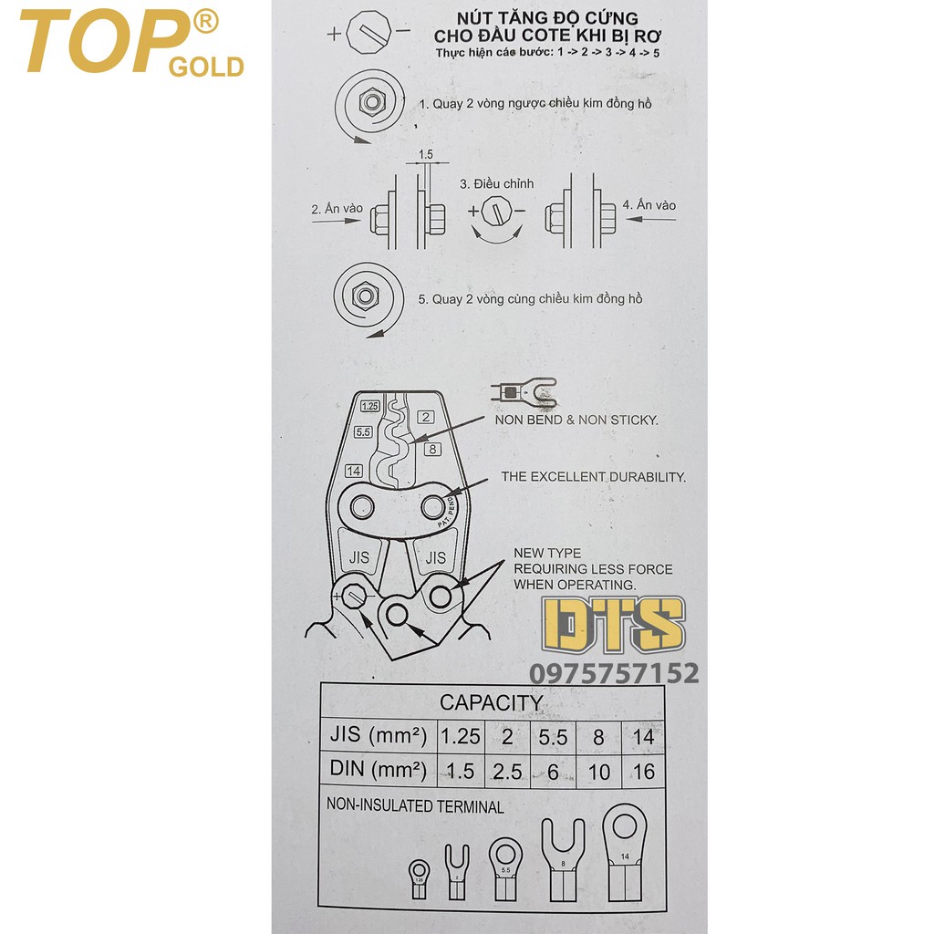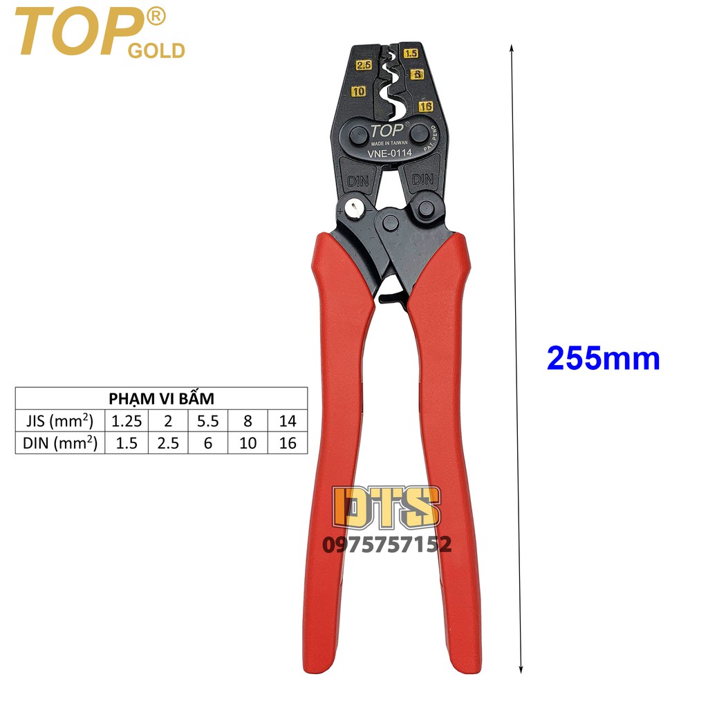 Giới thiệu Kìm bấm cos trợ lực số 14 1.5 -> 16 mm2 TOP GOLD, tiết kiệm lực, độ chính xác cao, có nút điều độ rơ (Kềm bấm cốt 16L)