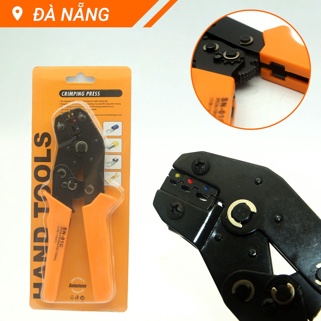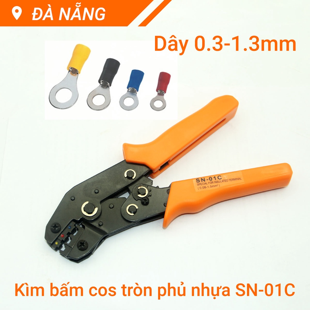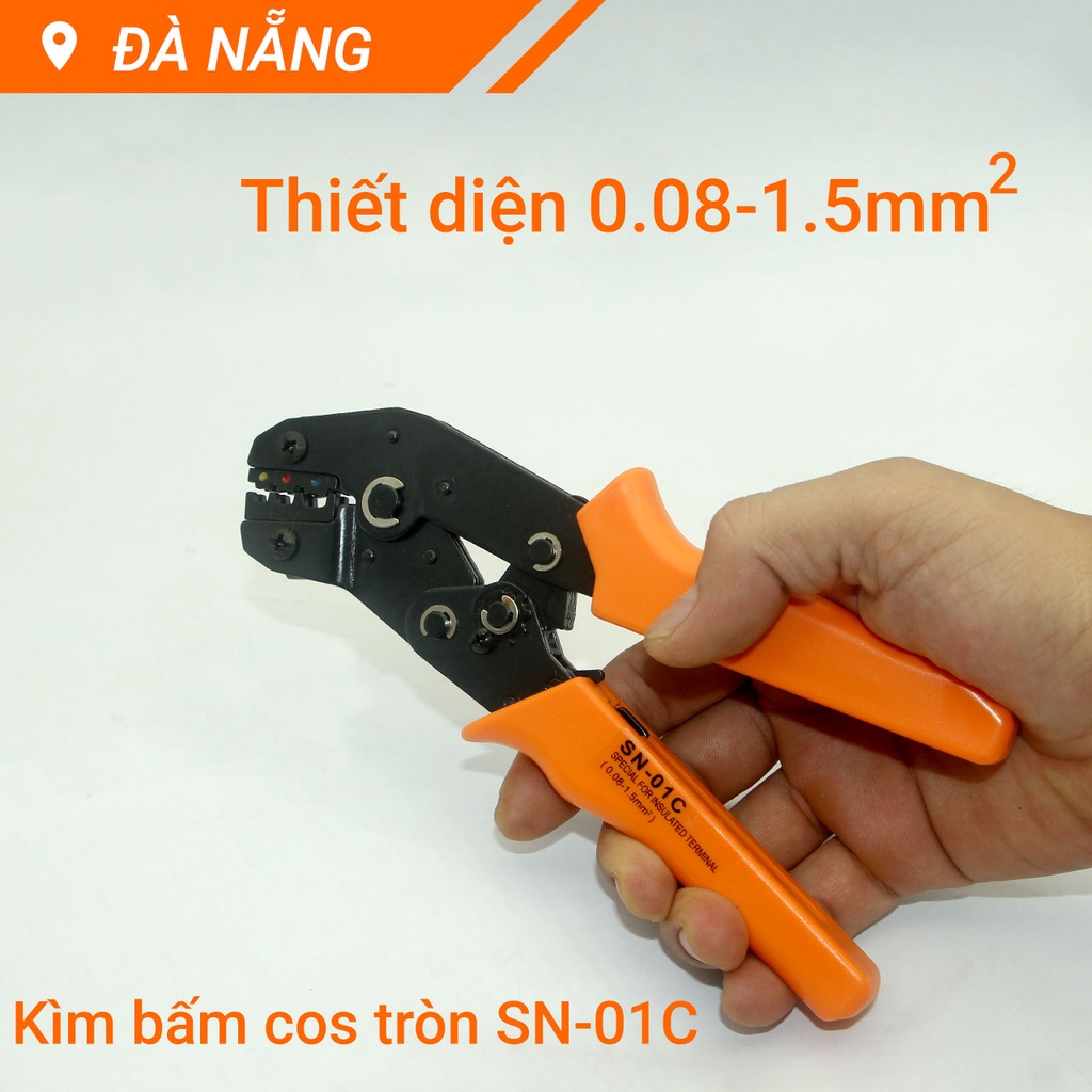 Kìm bấm cos tròn phủ nhựa SN-01C là dòng kìm bấm cos chuyên dụng dành cho thợ điện áp dụng với dây có đương kính từ 0.3 đến 1.3mm với thiết diện dây từ 0.08 đến 1.5mm²Áp dụng với dây có đường kính 0.3 đến 1.3mm