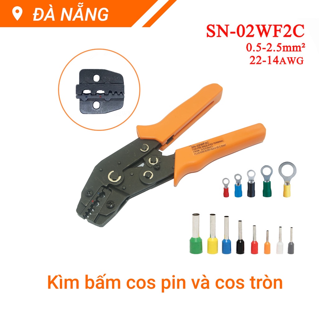 Kìm bấm cos SN-02WF2C có thể bấm cos tròn và cả cos pin rỗng với dây Φ 0.5 - 1.6 thiết diện sau khi bấm 0.25-2.5 mm² hay dây đồng với chỉ số Mỹ 24-14 AWG.Tổng chiều dài kìm: 190mm