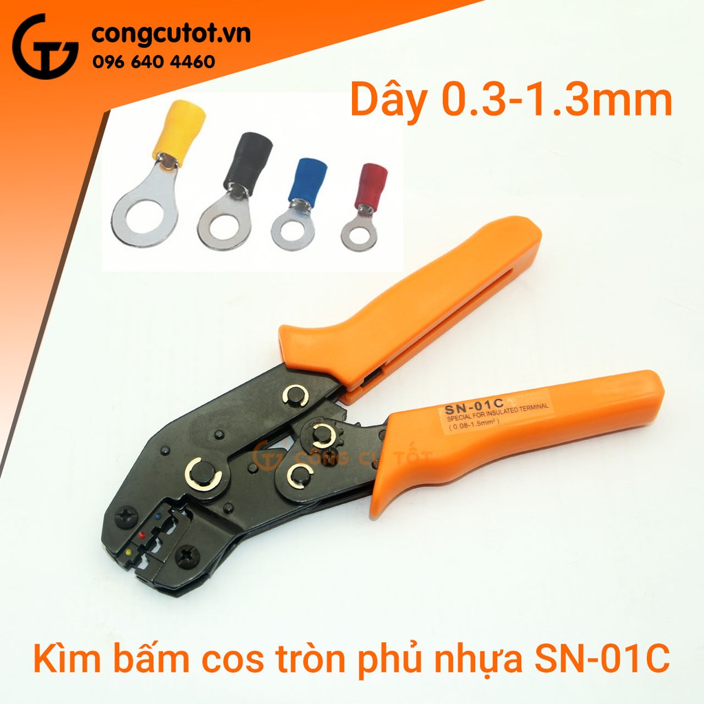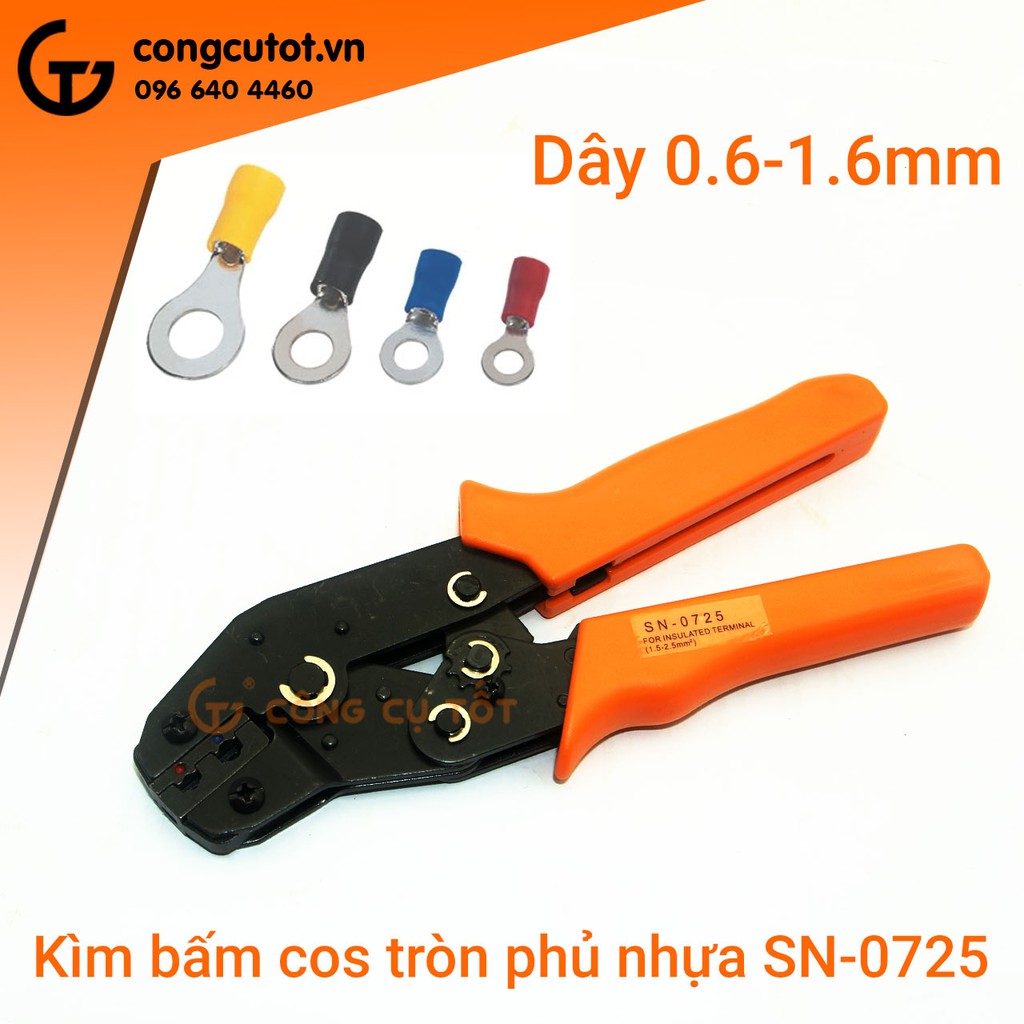 Kìm bấm cos tròn phủ nhựa là dòng kìm bấm cos chuyên dụng dành cho thợ điện áp dụng với dây có đương kính từ ( 0.6 đến 1.6mm ), từ ( 0.3 đến 1.3mm ) hoặc từ ( 0.5 đến 1.6mm ) với thiết diện dây từ ( 0.5 đến 2.5mm² hay 22 -14 AWG ), từ ( 0.08-1.5mm² hay 28 -16 AWG), hoặc từ ( 0.25-2.5mm² hay 24 -14 AWG ) theo tiêu chuẩn Mỹ. Tay cầm bọc nhựa cứng cao cấp cách điện. Kìm bấm cos được làm từ thép hợp kim.Kìm bấm cos tròn SN-0725 được sử dụng để nối các tiếp điểm mà dùng các loại kìm bình thường sử dụng không được . Với các loại kìm đủ kích cỡ thì kìm bấm cos tay có thể bấm được những dây có thiết diện nhỏ hẹp.