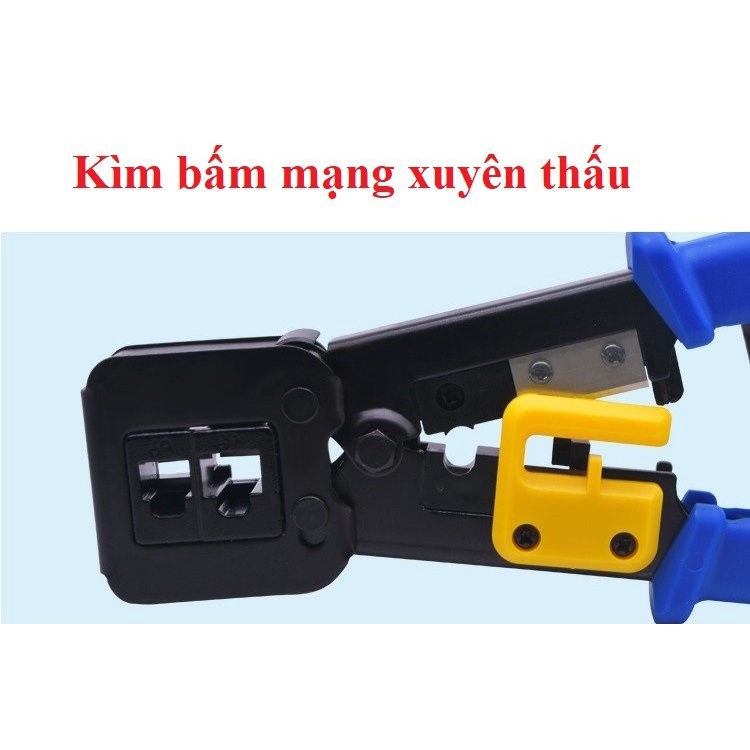 Kìm bấm mạng xuyên thấu là thiết kế đặc biệt , phá cách hiện nay , dùng bấm tất cả cácđầu bấm mạng chuẩn RJ11,RJ45 cat5e, cat6 ( thông thường) , và đầu bấm mạng có lỗ xuyên thấu trên đầuKìm được thiết kế lưỡi dao cắt trên cắt phần lõi cáp mạng dư ra rất hiệu quả.