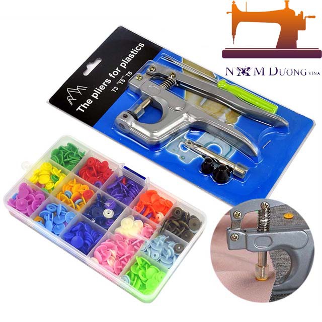Kìm bấm khuy nhựa, cúc nhựa dùng để bấm quần, áo sơ mi, áo mưa, vỏ chăn, gối, bấm để mở quai giày, dép thay cho nhám dính vì cúc nhựa bền hơn và dễ sử dụng hơn rất nhiều.