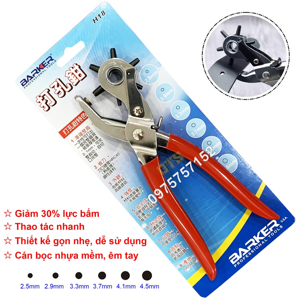 Nếu bạn cần đục lỗ trên thắt lưng, đục lỗ trên vải hay da, bìa cứng. Điện máy DTS xin giới thiệu sử dụng kìm bấm lỗ Barker vừa có lỗ đều và đẹp, vừa nhanh và không mất nhiều công sức. Kìm bấm lỗ Barker không thể thiếu của thợ may hay làm đồ da, rất tiện lợi và dễ dàng sử dụng, thao tác.* Thông tin sản phẩm: