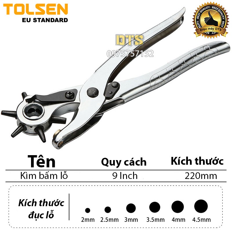 - Kìm bấm lỗ Tolsen là sản phẩm chất lượng cao chuyên dùng để bấm lỗ vật dụng bằng chất liệu như da, giấy, vải, ... Ứng dụng rộng rãi trong gia đình, xưởng cơ khí, sửa chữa... giúp bạn hoàn thành công việc 1 cách nhanh chóng và hiệu quả hơn.