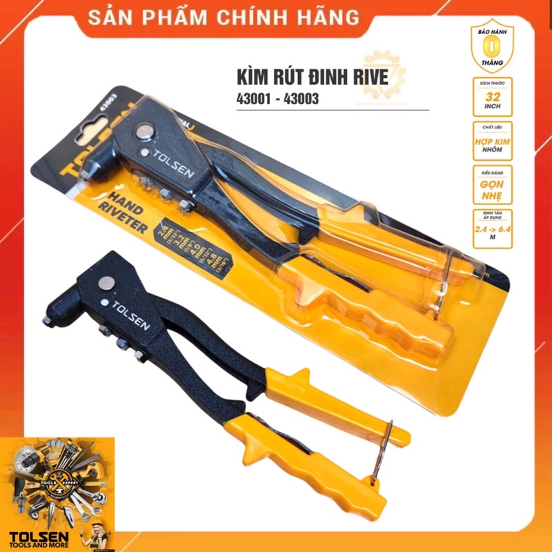 - Kìm rút đinh Rive Tolsen 43001, 43003 chính hãng là một dụng cụ khá phổ biến được ứng dụng thường xuyên trong thi công, lắp đặt cửa nhôm, và các thợ lắp ráp tủ sắt…. kìm có công dụng bấm tán đinh Rive bằng nhôm, sắt inox.
