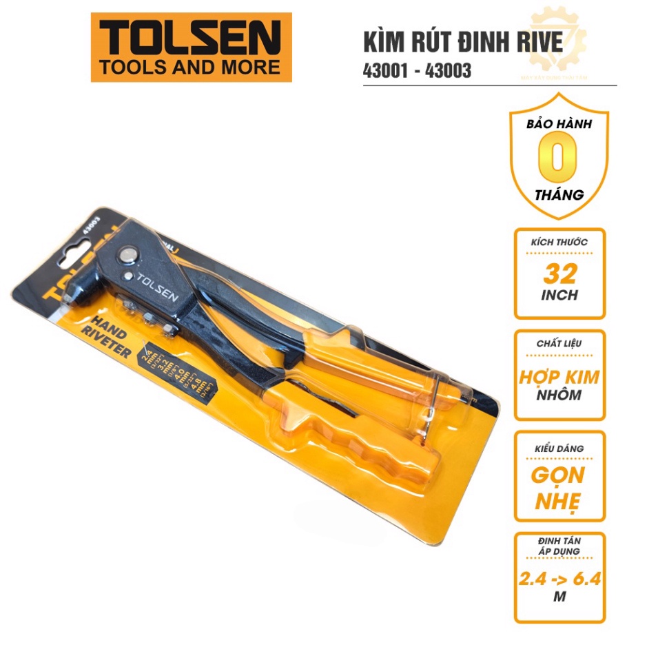 - Kìm rút đinh Rive Tolsen 43001, 43003 chính hãng là một dụng cụ khá phổ biến được ứng dụng thường xuyên trong thi công, lắp đặt cửa nhôm, và các thợ lắp ráp tủ sắt…. kìm có công dụng bấm tán đinh Rive bằng nhôm, sắt inox.