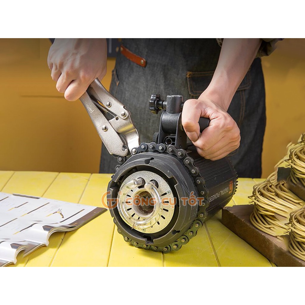 Bước 4: Cầm kìm bấm xoay tròn, dây xích sẽ bám chặt lên bề mặt của dụng cụ muốn mở. Điều chỉnh hướng xoay để đáp ứng yêu cầu vặn chặt, hay tháo mở ống